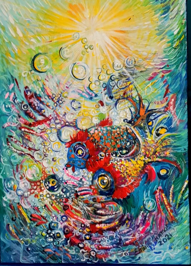 Invoking Rumi, Shafique Farooqi’s Whirling Dervishes transports the viewer to a spiritual realm in an ecstasy of colour. His images swirl and melt into the heavens above joining mind, heart, and body as they seek oneness with God. Having spent a significant part of his life in Turkey, Farooqi’s art has been deeply inspired by Sufism. His recent endeavor is his book on art and mysticism “The Tale of Drunken Flute in Whirling Dervishes”.